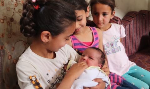 Baraa's daughters lovingly hold their newborn baby sister, Lynn .