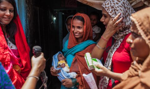 A mother and her newborn baby girl are visited by ActionAid staff to celebrate the fact that her baby is a girl, in Delhi, India.