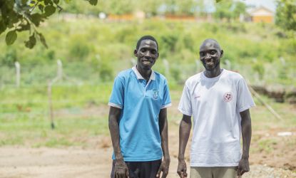 Moses (white shirt) and David (blue shirt), from South Sudan, now live in Imvepi refugee settlement and are vocal advocates for the rights of women and girl
